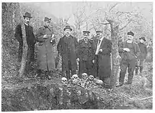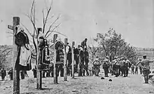 Mass killings took place in numerous towns in northern Serbia. On 17 August 1914, in Šabac, 120 residents—mostly women, children and old men—were shot and buried in a churchyard by Austro-Hungarian troops on the orders of Feldmarschall-Leutnant Kasimir von Lütgendorf.[4] The remaining residents were beaten to death, hanged, stabbed, mutilated or burned alive.[5] A pit was later discovered in the village of Lešnica containing 109 dead peasants who were "bound together with a rope and encircled by wire"; they had been shot and immediately buried, even with some still alive.[6] A claim from a local spy that "traitors" were hiding in a certain house was enough to sentence the whole family to death by hanging. Priests were often hanged, under the accusation of spreading the spirit of treason among the people. Victims were usually hanged on the main squares of villages and towns, in full view of the general population. The lifeless bodies were left to hang by the noose for several days as an act of intimidation.[7][8]
