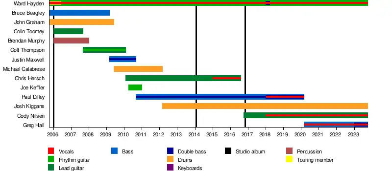 - Ward Hayden — lead vocals, rhythm guitar, double bass, drums (2005–present)