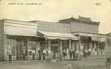 Several former buildings in Washburn's commercial district as they appeared circa 1910. In the second half of the 20th century, most of the town's commercial structures fell into disrepair and were razed.