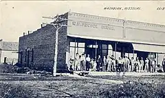 Following the establishment of the railroad and the growth of the former O’Day community, many businesses were established in what is now Washburn. Among these were the O’Day House Hotel, Felker & Johnson's mercantile, the Pratt or Cunningham grocery store, J. M. Holton's mercantile, Denbo's grocery, the Brookshire & Chandler drug store, and W. B. Adcock's drug store. Many of these businesses had previously been located in the old Keetsville site, but moved to take advantage of the railroad. The O’Day Globe newspaper was founded in 1887. That same year, Irishman Timothy Patrick Mooney (1833-1912) moved his store and warehouse there from Washburn. In 1887 Reece Brothers built a large store and Postmaster James Buchanan Hurst (1859-1934) a post-office building.[6]