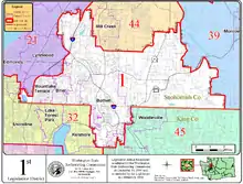 Washington's 1st legislative district is one of 49 districts in Washington state for representation in the state legislature. The T-shaped district is mostly north of the borders of King and Snohomish counties, stretching from High Bridge Road and Broadway Avenue in the east through the entirety of the cities of Bothell and Brier to I-5 in Mountlake Terrace in the west, though the district sweeps south of Bothell to part of Kirkland and reaches to Lake Washington.[1]