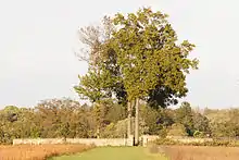 The original allée was planted in the mid-1920s by Princeton Nurseries, at one time the country's largest commercial plant nursery.[2] The Elm trees are of the Princeton variety, developed by Princeton Nurseries for its landscaping quality, and are resistant to Dutch elm disease, the only one of ten resistant cultivars to have trees that have reached maturity.[3] Of the original 136 Elms planted in the 1920s only 76 survive. They are approximately 24–26 inches (610–660 mm) in diameter and 60 feet (18 m) tall. Their branches meet over the roadway to provide a leafy canopy. The allée has many replacement trees, including 16 Norway maples planted in the 1960s, and 31 Liberty elms planted in 1995. The secondary rows of Delaware Elms were planted in 1983, and a long row of forsythia to the east is thought to date from the late 1960s.[4]