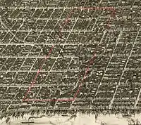 The land area of Society Hill is approximately 0.254 square miles (163 acres).[4] Bordering the Delaware River just south of Old City and Independence Hall, Society Hill is loosely defined as bounded by Walnut, Lombard, Front and 8th Streets.[1] The Society Hill Civic Association further subdivides Society Hill along Spruce Street and 4th Street into quadrants by intercardinal directions: northeast (NE), southeast (SE), southwest (SW), and northwest (NW).[18] Across different sources, variation in the exact border includes extending the eastern boundary to the Delaware River,[19][1] the southern border to South Street, the northern border to Chestnut Street, or limiting the western border to 7th Street.[20][21]