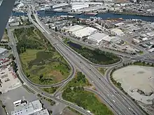 The freeway was planned to be extended south to SR 516 in the 1970s after a 4-mile (6.4 km) right-of-way was acquired by WSDOT before the project was canceled due to public opposition.[40] The King County Department of Public Works recommended extending SR 509 southeast from South 188th Street to I-5 in 1988, with construction planned to begin in 1999 at an estimated cost of $252 million in 1996,[39][41] raised to $1.4 billion a decade later.[42] A freeway bypass of the Port of Tacoma for SR 509 was proposed in 1990 as a supplement to the newly completed I-705 and funded with a $180 million grant from the Federal Highway Administration approved the following year.[43] Construction began in early 1994 amid controversy over the freeway's effects on the redevelopment of the Thea Foss Waterway.[44][45] The first section of the new freeway opened in August 1995, while the cable-stayed bridge over the Thea Foss Waterway and single-point urban interchange with I-705 opened on January 22, 1997.[46][47] The project cost a total of $165.3 million to construct, with the majority of funds from the federal government and a land claims settlement with the Puyallup Tribe.[47] The Blair Bridge was closed and demolished to make way for a wider channel on the Blair Waterway for larger container ships.[48]