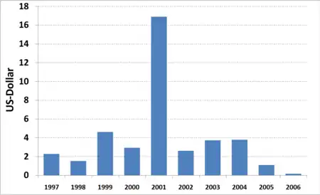 According to the Honduran ministry of finance, US$262 million were invested in the sector between 1997 and 2006, which is on average US$4 per capita and year. The annual investment mostly ranged from US$1.1 and US$4.6 per capita. In 2001 it was extremely high, reaching US$16.9. On the other hand, in 2006 it was at only US$0.2 per capita[30] On average, the investment level is similar to Costa Rica and Mexico, but lower than South American countries like Argentina, Peru and Colombia.[31]