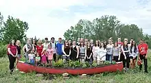 Students from Waterdown District High School, and members of the community, plant the Souharissen Canoe Garden in 2015. The garden is filled with soil and medicine gifted by the Mississaugas of the New Credit Nation.