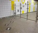 All stations on the East Line were set for another renovation in 2016. The renovation of Waterlooplein commenced in September. The architect of the renovation wanted to revert to the brutalist architecture used in the original station design. Paint on the walls were removed to reveal the bare concrete. Metro traffic still continued as entrances were closed one by one.[21] Some of the features added after initial construction, such as the usage of primary colours and a black ceiling, were kept after the renovation.[22] Windows were created at two of the entrances.[23][24] Cables, cable ducts and pipes were concealed for tidiness.[25] Het Parool wrote that after the renovation "[the station] suddenly look[s] as if [it is] no longer just from the past, but also a bit from now."[26] In April 2017, the Gemeente Vervoerbedrijf started to play music through the speakers of underground metro stations as a test. The type of music would depend on the time of day: slow and calming music during rush hours, and energetic music during the afternoon.[27]