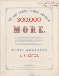"We Are Coming, Father Abra'am", is a poem written by James S. Gibbons, set to music by eight different composers, including Stephen Foster. William Cullen Bryant published one version (with music by Luther Orlando Emerson (1820โ€“1915). Bryant's newspaper originally published the poem and, because it was originally published anonymously, many assumed it was his, and it was widely republished, so Bryant issued a statement denying his authorship. The poem and music came in response to a call by Abraham Lincoln on July 1, 1862 for volunteers to fight for the U.S. in the American Civil War. It was published in the New York Evening Post soon after, on July 16, 1862. [1]