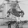A Sea King helicopter lands a payload on the deck of HMS Invincible.
