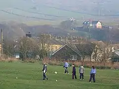 Weir straddles the A671 road and is located by Deerplay Moor, the source of the River Irwell, and adjacent to the parish of Cliviger. Weir is serviced by Northern Primary School in Broadclough,[2] has a church and community centre (the Doals Centre), an award-winning cafe-bar (Anna's), and a Riding Centre (Weir Riding Centre). Weir was previously serviced by two pubs, the Weir Hotel and the New Deerplay in nearby Cliviger (once the 12th highest pub in England at 1,310 ft[3]). These pubs are set to become business and residential developments.[4][5]