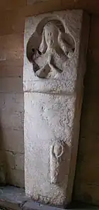 Welby's Grade I listed Anglican parish church is dedicated to St Bartholomew the Apostle.[5] The church originates from the 13th century and is mainly Early English, but with a Perpendicular clerestory and porch.[6] In 1873 the north aisle was extended and the chancel rebuilt by J. H. Hakewill, who matched the Early English style.[7][8] Within the porch is a 14th-century stone tomb cover with relief depictions of a woman's head and shoulders, within a quatrefoil recess, along with a shrouded baby. It was originally sited in the graveyard.[7]