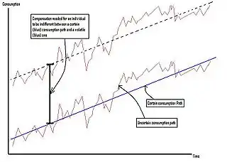 If we consider two consumption paths, each with the same trend and the same initial level of consumption – and as a result same level of consumption per period on average – but with different levels of volatility, then, according to economic theory, the less volatile consumption path will be preferred to the more volatile one. This is due to risk aversion on part of individual agents. One way to calculate how costly this greater volatility is in terms of individual (or, under some restrictive conditions, social) welfare is to ask what percentage of her annual average consumption would an individual be willing to sacrifice in order to eliminate this volatility entirely. Another way to express this is by asking how much an individual with a smooth consumption path would have to be compensated in terms of average consumption in order to accept the volatile path instead of the one without the volatility. The resulting amount of compensation, expressed as a percentage of average annual consumption, is the cost of the fluctuations calculated by Lucas. It is a function of people's degree of risk aversion and of the magnitude of the fluctuations which are to be eliminated, as measured by the standard deviation of the natural log of consumption.[6]