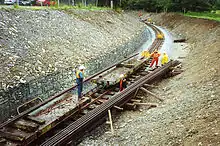 Tracklaying on phase 2, as on phase 1 was undertaken by Welsh Highland Light Railway Ltd using Ffestiniog and Welsh Highland Railway staff and volunteers including, notably, the Welsh Highland Railway Society North Wales Group track gang who laid the first mainline section in April 2000. The rails, sleepers and fastenings again came mostly from South Africa where they had been first used on the lifted Umzinto-Donnybrook line. The entire four-mile (6 km) tracklaying was completed in under six months.
