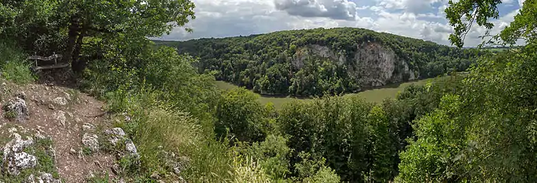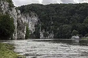 In addition, the area is also geotope no. 273R005.[3] In 2002 the Weltenburg Narrows was awarded an official seal by the Bavarian Minister for the Environment for being one of Bavaria's most beautiful geotopes.[4] In 2006 The Danube Gorge was listed among the 77 outstanding national geotopes of Germany.[5]