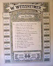 His operas, his cantatas, and his instrumental music underline this. Even if his "absolute" music pays homage to one of the great string quartet and successful "obligatory violin parts" to Bach's Well-Tempered Clavier, he displays in his other works a clear tendency for program music. Weißheimer's piano pieces Reminiscence of Gioventu and At Beethoven's Grave, as well as his Symphony for Schiller's Knight Toggenburg match the spirit of the New German School. His literary taste is evident in the texts he set to music. German minstrel poems, texts by Johann Wolfgang von Goethe, Friedrich Schiller, Körner, Heinrich Heine and others found a musical home in his songs and cantatas.