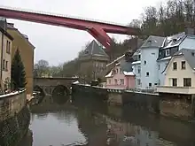 Apart from finishing the construction projects started under previous governments, the Werner-Schaus government also started another large infrastructure programme: expanding Luxembourg City towards the East.[5] The law of 7 August 1961 created a Fund for Urbanisation and Development of the Plateau of Kirchberg.[5] The development of more than 300 hectares opened up a new space, intended to host the European institutions.[5] The Luxembourgish government constructed a European quarter on the Kirchberg, and would then lease the buildings to the European Communities.[5] The decision to erect a European administrative centre constituted another asset in its policy aiming to make Luxembourg the permanent headquarters of one, several, or all European institutions.[5] The construction of the Grand Duchess Charlotte Bridge, spanning the valley between the city centre and the Kirchberg plateau, started in 1963.[5]