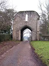 The ruined priory gatehouse is a grade I listed building, the north side of which has a two centred arch surmounted by three shields with coats of arms, legible in the 18th century as the arms of de Toni and the Earls of Warwick.[1]