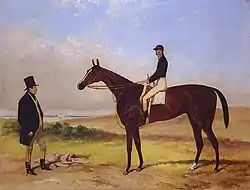 West Australian was a "hard, yellow" bay horse standing 15.3 hands high with a narrow white blaze bred by John Bowes of Streatlam Castle, County Durham. He was described as having a "blood-like head... peculiar ears... good shoulders... clean-looking legs" and "plenty of bone". The New Sporting Magazine called him "one of the finest specimens of English racehorse ever seen".[2] He was foaled in 1850, being by Melbourne the sire of seven classic winners. He was the second foal[3] of his dam Mowerina, a daughter of Touchstone, who had finished second in the 1,000 Guineas Stakes and was a sister of the Derby winners Mundig and Cotherstone. Apart from West Australian Mowerina produced the winners Marley Hill (bl c 1851), Victoria (b f 1853), Go-Ahead Nassau Stakes, The Old Orange Girl (b f 1860 Kingston) thrice winner of the Bentinck Memorial Stakes, Baragah (ch c 1861 Stockwell) twice winner of the Bentinck Memorial Stakes and Ebor Handicap and Westwick (b c 1863 Stockwell).[4]