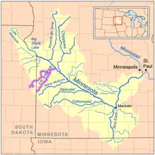 The Lac qui Parle River is a tributary of the Minnesota River, 118 miles (190 km) long, in southwestern Minnesota in the United States. A number of tributaries of the river, including its largest, the West Branch Lac qui Parle River, also flow in eastern South Dakota. Via the Minnesota River, the Lac qui Parle River is part of the watershed of the Mississippi River, draining an area of 1,156 square miles (2,990 km2) in an agricultural region. Slightly more than two-thirds of the Lac qui Parle watershed is in Minnesota.[4] Lac qui parle means "lake which speaks" in the French language, and was a translation of the Sioux name for Lac qui Parle, a lake on the Minnesota River upstream of the mouth of the Lac qui Parle River.[6][7]
