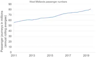 Passenger journeys on the West Midlands rail franchise from 2010–11 to 2018–19[4]