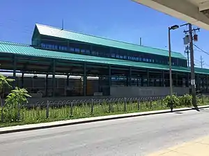 The station includes a large parking lot accessible from Lorain Avenue. The access road has been named Lloyd Peterson Lane. A station lobby building is located on the southeast side of the parking lot adjacent to the tracks. The station headhouse includes bus loading areas and also houses a training facility, which opened in 1983.[4] The headhouse is connected to the platforms by a tunnel extending underneath the westbound track.