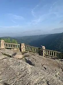 Lovers Leap is a story similar to Romeo and Juliet. It is about a young Indian of the Cherokee tribe who was out on his first hunt after becoming a man. He went out to a valley with the rest of the men from his tribe. They all split up during the day and the new man travelled further from the camp than he should have. While away, he saw a young girl on the ridge above him. The young girl was of the Shawnee tribe. They saw each other every day while on the hunt. Finally the young man desired to hunt a deer more than anything, but apparently Cupid drew his bow faster and the struck the young Cherokee man. The young Cherokee and Shawnee fell in love and spent much time together that season. One day, the father of the girl caught them and began to drag his daughter away. He told her he could never see someone of the Cherokee tribe, but instead of parting ways, the young Shawnee girl ran to her lover and leaped into his arms. Together, they jumped off the precipice and met their premature demise in the jagged bottom. To this day, that precipice is still called Lovers Leap.[10]