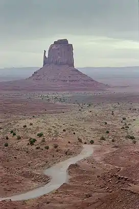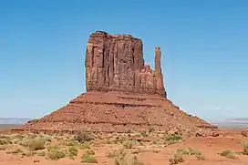The West and East Mitten Buttes (also known as the Mittens) are two buttes in the Monument Valley Navajo Tribal Park in northeast Navajo County, Arizona. When viewed from the south, the buttes appear to be two giant mittens with their thumbs facing inwards.