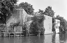 Reynier Reael gave credit to ship carpenters, who did not have to pay rent for the first twelve years, but had to deliver a ship. His heirs had houses built on the island, which the city opposed.[9] The tar company of Joseph Deutz got a large yard on the Realen Island in 1664.[10] Until 1673 there was also a peat market. The Dutch West India Company owned a ropery which was sold in 1650. The city owned carpentry yard. As early as 1676 there was a brandy distillery at the Drieharingenbrug, called De drie gecroonde haringen (The three crowned herrings). These business premises were demolished around 1780 by shipbuilder Haring Booy and rebuilt as a sort of country house.[11] For many years, the tobacco firm British American Tobacco was established on Realeneiland. The island became known through the books of Jan Mens about the Golden Reael.