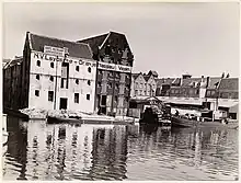 Former salt shack (Heinsiusketen) and wine warehouse in 1945; to the right tar stored in tubs.[8]