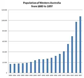 The population in Western Australia in 1891 was 49,782. By 1895 it had doubled to 100,515, and by 1901 was 184,124.[2]