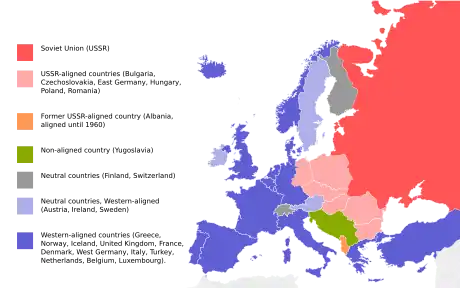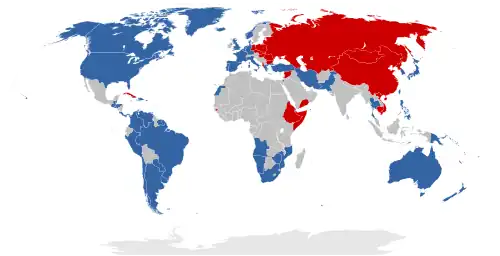 The Western Bloc is an informal, collective term for countries that were officially allied with the United States during the Cold War of 1947–1991. While the NATO member states, in Western Europe and Northern America, were pivotal to the bloc, it included many other countries, in the broader Asia-Pacific region, the Middle East, Latin America, and Africa with histories of anti-Soviet, anti-communist and, in some cases anti-socialist, ideologies and policies. As such, the bloc was opposed to the political systems and foreign policies of communist countries, which were centered on the Soviet Union, other members of the Warsaw Pact, and usually the People's Republic of China. The name "Western Bloc" emerged in response to and as the antithesis of its Communist counterpart, the Eastern Bloc. Throughout the Cold War, the governments and the Western media were more inclined to refer to themselves as the "Free World" or the "First World", whereas the Eastern bloc was often referred to as the "Communist World" or less commonly the "Second World".