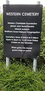 Western Cemetery is a Jewish cemetery at Bulls Cross Ride in Cheshunt in the Borough of Broxbourne, Hertfordshire EN7 5HT, England. It was established as the cemetery of the Western (now Western Marble Arch) Synagogue, as well as the independent West End Great Synagogue.[1] It is now run by the Western Charitable Foundation, which extends burial rights to the Jewish Joint Burial Society,[nb 1][2] Liberal Judaism and Waltham Forest Hebrew Congregation. It has two prayer halls – The Barnett Ohel, dating from 1967, and the Gee Ohel.