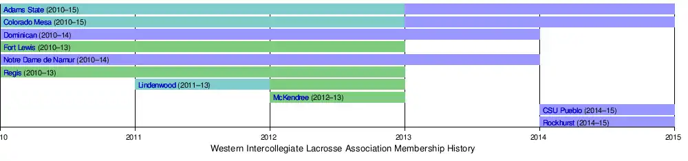 Lindenwood University joins the conference beginning with the 2011–2012 academic year with both men's and women's teams.[4] They replaced Grand Canyon University, which left the conference at the end of the 2010–2011 season, after the university announced that their program would compete at the club level in the Men's Collegiate Lacrosse Association.[5][6] The WILA concluded its second season in April 2012. Colorado Mesa won the association's men's championship with a conference record of 6-2;[7] the championship was the first for Colorado Mesa in the program's second year of NCAA lacrosse competition.[8] On the women's side, Lindenwood won the 2012 WILA women's lacrosse championship in the program's first season of NCAA competition. The Lady Lions recorded an 8-0 conference record en route to the title.[9] The season saw additional membership changes when Lindenwood announced its men's program would join the new ECAC Division II Lacrosse League starting in the 2012–2013 academic year.[10] The announcement was followed a week later by the addition of McKendree University's new women's lacrosse program starting in the 2012–2013 academic year.[11]