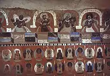 The Western Thousand Buddha Caves (Chinese: 西千佛洞; pinyin: Xī Qiānfó Dòng) is a Buddhist cave temple site in Dunhuang, Gansu Province, China. The site is located approximately 35 km southwest of the urban centre and about the same distance from the Yangguan Pass; the area served as a staging post for travellers on the Silk Road.[3] It is the western counterpart of the Mogao Caves, also known as the "Caves of the Thousand Buddhas" after the founding monk Yuezun's vision in 366 of "golden radiance in the form of a thousand Buddhas".[4] The caves were excavated from the cliff that runs along the north bank of the Dang River. A number have been lost to floods and collapse; some forty are still extant. Twenty-two decorated caves house 34 polychrome statues and 800 m2 of wall paintings, dating from the Northern Wei to the late-Yuan and early-Ming Dynasties (sixth to fourteenth centuries).[3] The site was included within the 1961 designation of the Mogao Caves as a Major National Historical and Cultural Site.[5]