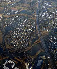 Westfield is an area of the town of Cumbernauld in Scotland. Westfield is a popular residential area originally built by Cumbernauld Development Corporation in the late 1970s and early 1980s (construction began 1975).[2] It comprises a residential area and a large industrial estate.[3] Historically there was a farm at Westfield as shown on Roy's map of the Lowlands[4] and the 1st 25 inch Ordnance Survey Map of Scotland.[5] It is located near Condorrat and Broadwood Stadium, home of Clyde FC. Historically, there were two local primary schools, St Francis of Assisi Primary School and Westfield Primary School. St. Francis of Assisi Primary School closed in 2009. The site has been re-developed by North Lanarkshire Council with new, high quality social housing available to rent. The new street is named Netherinch Way. Westfield also has other modern, private developments for example a new Bellway Housing development sits near Broadwood stadium along with a neighboring housing development. Westfield has a selection of frequent bus services to Airdrie, Cumbernauld Town Centre, Glasgow, Kilsyth and Kirkintilloch with buses operated by David Allan Coaches, First Group & McGills. In 2017 plans for a new retail park near Broadwood Studium were approved.[6]