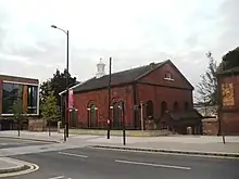 In 1752 the chapel was replaced by the current building. Later in the century, the congregation joined the Unitarian movement.[2] It is built of brick, and is two storeys high and three bays long. It is in the Doric order, with a cupola. There are several Venetian windows on the ground floor. Inside the chapel is plain,[3] with a pulpit of 1737 moved from the former chapel, and an organ constructed in 1847.[2] Most of the woodwork dates from the late 19th century.[3] There are catacombs under the chapel, which are occasionally opened to the public.[4][5]