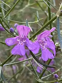 Westringia eremicola is a slender shrub growing to 1.5 m (4 ft 11 in) high. The leaves are on a petiole 0.5–0.7 mm (0.020–0.028 in) long, usually in whorls of three, narrow-elliptic to linear, mostly 8–20 mm (0.31–0.79 in) long, 0.8–1.6 mm (0.031–0.063 in) wide, margins smooth, curved under, and both surfaces with more or less flattened, simple, upright hairs. The flowers are borne in leaf axils usually at the end of branches, they may be mauve, purple or occasionally white, corolla 6.5 mm (0.26 in) long, petals triangular, 1–3 mm (0.039–0.118 in) long, 1–2 mm (0.039–0.079 in) wide, and the lower petal has orange to brown spots. Flowering may occur anytime throughout the year and the fruit is a mericarp 1.3–1.5 mm (0.051–0.059 in) long.[2][3][4]
