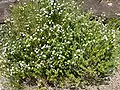The flowers are white, hairy and have the upper petal divided into two lobes. They also have orange-to-purply spots on their bottom half. This shrub is very tough and grows on cliffs right next to the ocean.