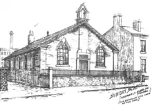 From the outset, the Minister at Westwood taught children reading, writing and arithmetic in evening classes. Sunday School teachers also gave lessons at morning and afternoon sessions. The law at that time allowed children and young people to work up to twelve hours a day in mills and factories, with breaks amounting to one and a half hours for meals.[25] State education was not provided in England until 1870. Even then, insufficient school places meant that many children could not be taught. In 1870, there were 18,085 children of school age in Oldham of whom roughly half actually attended school. Just over 2,300 were taught in private schools. Records show that the Westwood Sunday School building was hired by day school teachers for private tuition.[26] The School Hall was also used as an Employment Exchange from 1922 to 1957.[7]