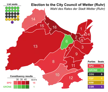 The Wetter city council governs the city alongside the Mayor. The most recent city council election was held on 13 September 2020, and the results were as follows: