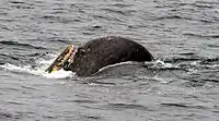 ![]() Sperm whale eating a fish off Kaikōura; surface feeding is not normal behaviour |