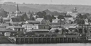 By March 1878 the station had a goods shed. In 1879 Saunders reclaimed land and built a wharf and McLean built another goods shed. Cattle yards were added in 1880. In 1881 a verandah was added to the goods shed.[4] In 1882 Freeman Jackson had a wool store built beside the station.[47] In 1883 Alexander & McFarlane added to the goods shed for £431-19s-8d. Further improvements were made to the station yard in 1895. By 1896 there was a 180 ft (55 m) x 42 ft (13 m) goods shed, loading bank, cattle and sheep yards, hand crane, coal yard and weighbridge.[4] In 1899 several improvements were planned, including a new engine shed and reclamation of the area above the half tide wall,[48] later marked as Government Reclamation on a plan of about 1905.[49] The wharf was extended by 625 ft (191 m) in 1909.[50][51] By 1914 there was a wagon repair shed.[4] In 1911 the yard was lit and in 1930 electric light was put in the wharf shed.[4]