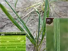 (A) Wheat curl mite (WCM) on a wheat leaf; (B) leaf curls caused by WCM; and (C) WSMV symptoms on wheat leaf