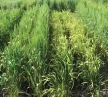 Winter wheatArapahoe’ showing advanced symptoms with streaks coalescing into almost solid yellow areas because of WSMV infection