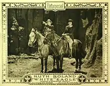White Eagle is a 1922 American silent Western film serial directed by Fred Jackman and W. S. Van Dyke. The film is considered to be lost.[1] White Eagle is almost a remake of the earlier Ruth Roland serial Hands Up[2] The serial features a famous scene of Ruth Roland climbing a rope ladder from a moving train to a plane flying overhead.[2]