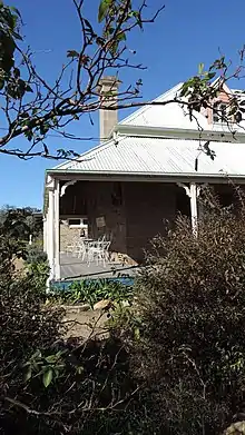 The exterior of the building is symmetrical in appearance. Timber steps to the verandah are centrally located in front of the main entrance door which is flanked by French doors. These replace the original inward opening single doors which are currently stored in the garage. Dormer windows with weatherboard sidings are located within the hipped roof at both the front and rear of the building, and align with the French doors below. Stone chimney shafts with moulded corbelling are situated at either end of the building.[1]
