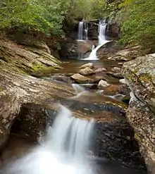 The falls is located on Whiteoak Creek, a tributary of the South Toe River, which itself is a tributary of the North Toe River.