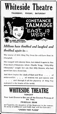 - 1 2 Whiteside Theatre debut advertisement, Corvallis Gazette-Times, Nov. 4, 1922, pg. 8.