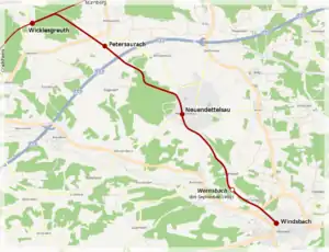 The Wicklesgreuth–Windsbach railway is an 11.8 kilometre long branch line, that branches off at Wicklesgreuth from the Nuremberg–Crailsheim railway.