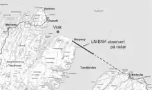 Four witnesses claimed to have observed fighter jets in the accident area.[36] A fisherman stated that he saw a Twin Otter and a fighter jet at the same time in the area, but could not remember if it was before or after the accident, nor even if it was the same day. In case it was after the accident, he would have been observing two of the search aircraft.[37] Some witnesses claimed to have seen a damaged Harrier at Bardufoss at the time of the accident. Some claimed the right wing was damaged, others the left wing or the belly. Some of the witnesses claimed there were remains of green paint on the aircraft. At the time of the accident, Widerøe did not have a dominant green paint scheme on its aircraft. The distance from Gamvik to Bardufoss is 430 kilometers (270 mi) and the Harrier would have to have flown out and back under radar coverage. A Harrier does not have sufficient fuel for such a round trip and the aircraft would have passed more than ten airports on the route from Gamvik to Bardufoss.[27]